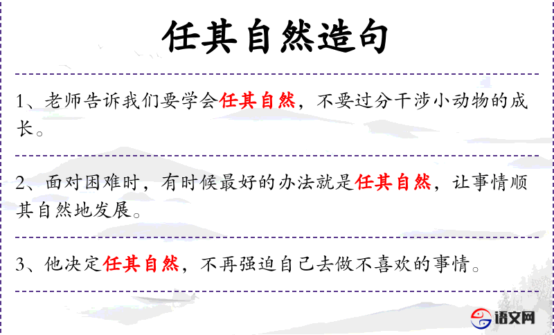 - 任其自然:意思是让事物按照其自身规律发展,不加人为干预。