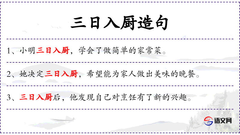 1. 【三日入厨】 古代风俗,新娘结婚三日后到厨房做饭。借指初入社会或刚任职。