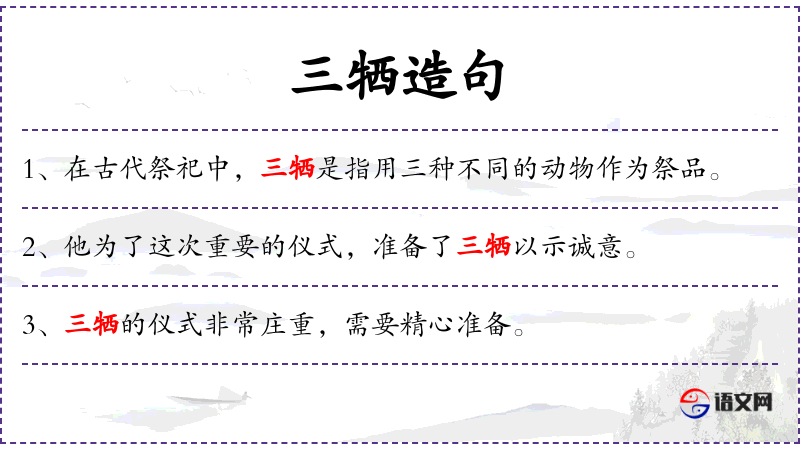 2. 【三牺】 三只纯色的牛; 指祭祀用的雁﹑鹜﹑雉。《左传.昭公二十五年》"为六畜﹑五牲,三牺,以奉五味。"孔颖达疏引服虔云"三牺,雁﹑鹜﹑雉。"一说指牛羊豕。