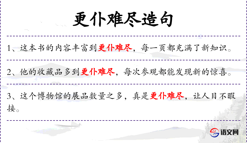 1. 【更仆难尽】 - 形容人或事物很多,数也数不过来。同“更仆难数”。