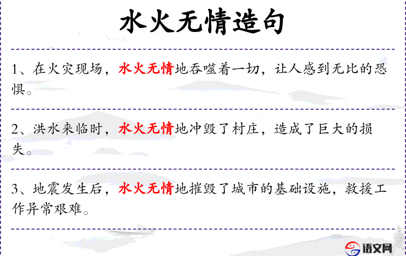 4. 【水火无情】 指水和火是不讲情面的,如疏忽大意,容易造成灾祸。