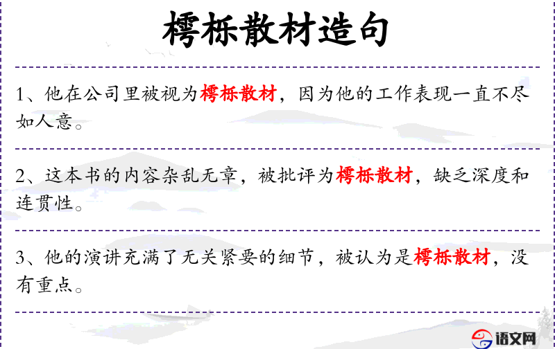 4. 【樗栎散材】 樗栎:不成材的树木。比喻平庸无用的人。常用作谦词。