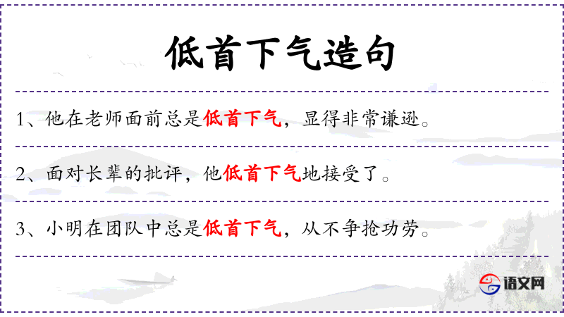 - 低首下气:形容词短语,表示谦卑、顺从的态度。