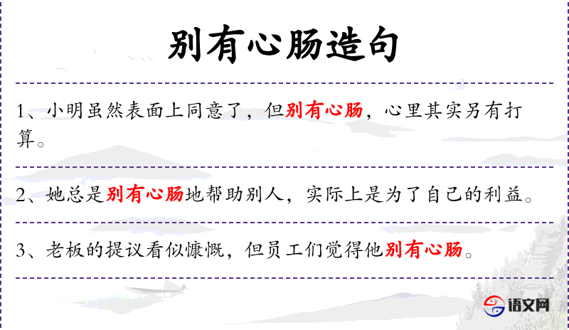 - 英文翻译直接表达了“别有心肠”为“ulterior motives”,清晰地传达了隐藏的意图。