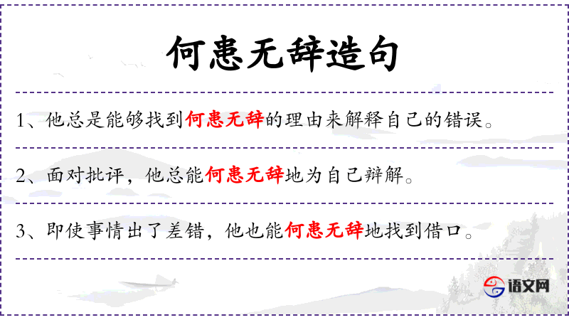 成语“何患无辞”源自**传统文化,反映了在面对困难或挑战时,人们总是能够找到解释或借口的一种文化观念。这个成语的使用也体现了汉语中成语的丰富性和表达的深度。
