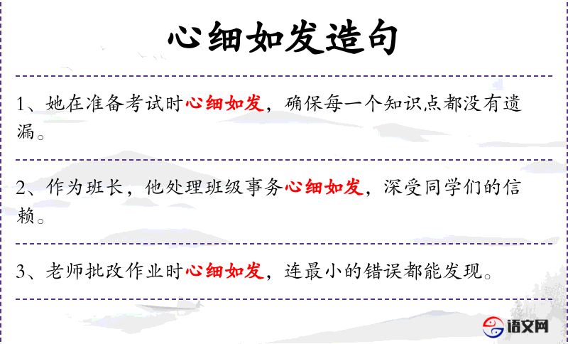 句子中“心细如发”是一个成语,源自文化,形容人非常细心。这反映了人对细节和精确性的重视。
