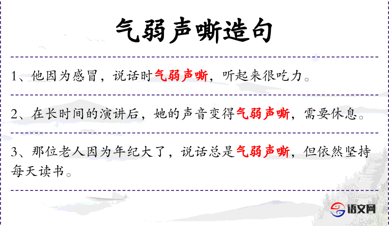 5. 【气弱声嘶】 弱:微弱;嘶:声音沙哑。气息微弱,声音沙哑。