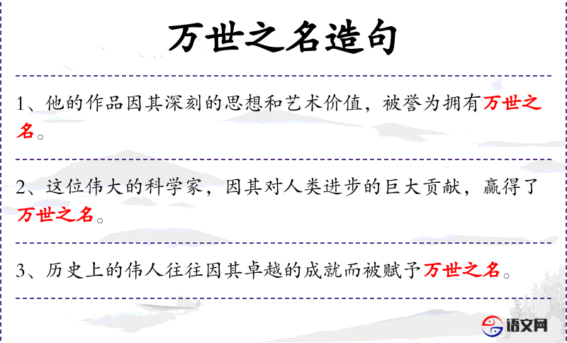 - 成语、典故:“万世之名”类似于“名垂青史”,都是用来形容某人的名声将永远被后人记住。