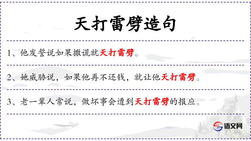 - “天打雷劈”这一成语在**文化中常用来形容极端的情况或强烈的情感,与忠诚和决心相关联。