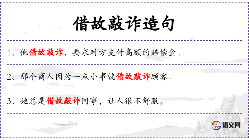 1. 【借故敲诈】 借:假托;故:借口。找借口敲诈、勒索别人的钱财。