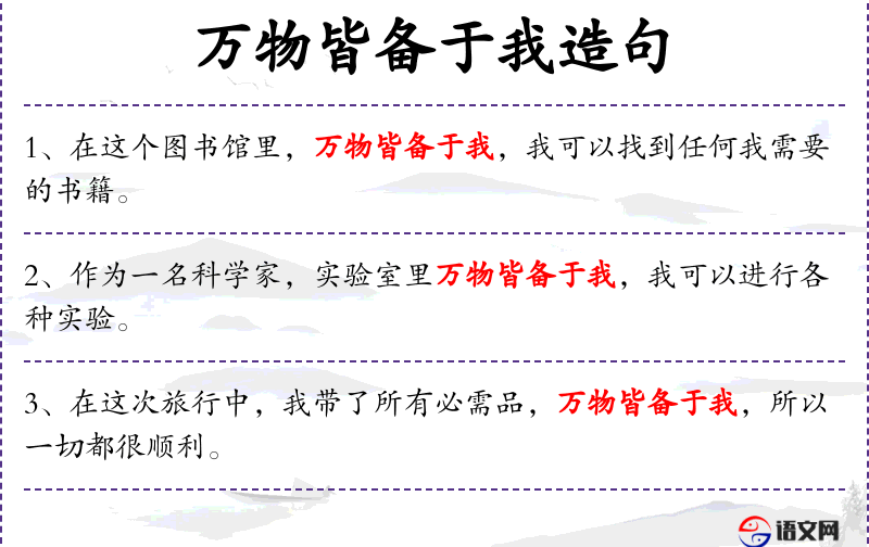- 万物皆备于我:表示所有需要的东西都为我准备好了。