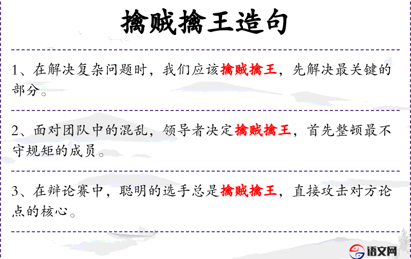- 文化背景和社会*俗中,“擒贼擒王”是一个常用的成语,强调解决问题要抓住关键和根源。