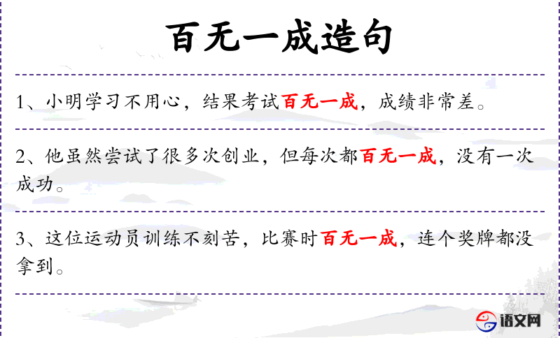 1. 【百无一成】 - 百:一切。形容一切的努力和作为没有一样成功,即毫无成就。