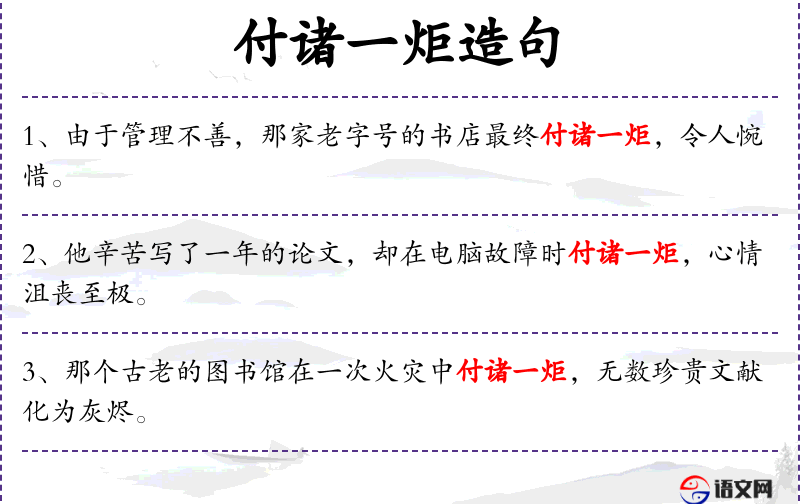 - 付诸一炬:成语,意指被火烧毁。