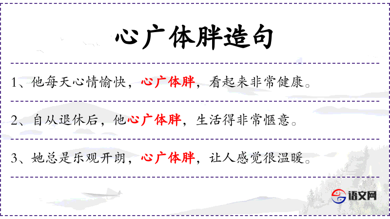 - 心广体胖:这个成语在**文化中常用来形容人心胸宽广,身体肥胖,是一种积极的健康状态。