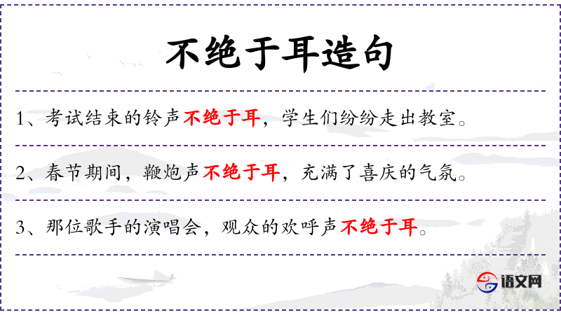 1. 【不绝于耳】 绝:断。声音在耳边不断鸣响。