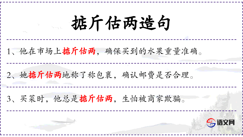 句子:“买菜时,他总是掂斤估两,生怕被商家欺骗。”