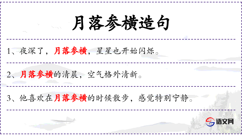 1. 【月落参横】 - 月亮已落,参星横斜。形容天色将明。