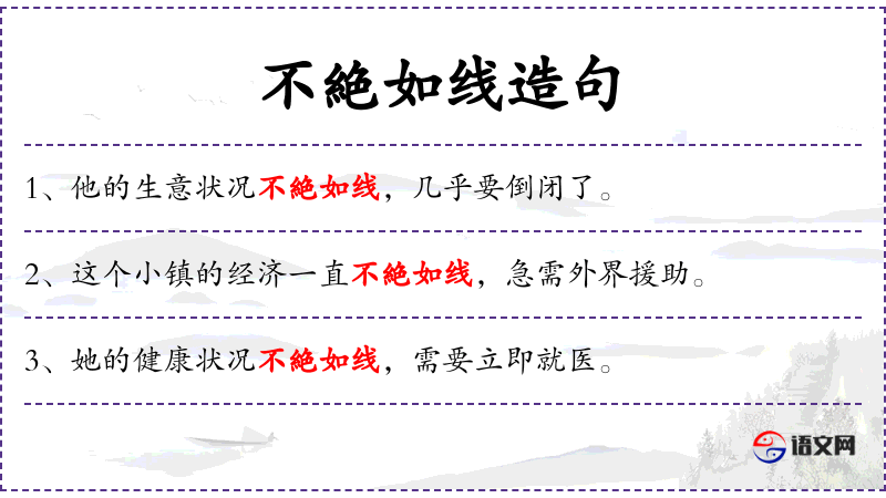 1. 【不絶如线】 亦作"不絶若缕"。亦作"不絶如缕"; 形容局势危急,象差点儿就要断掉的线一样; 形容子孙衰落或后继者稀少; 形容声音或思绪微弱。