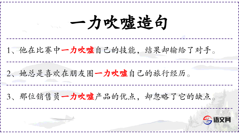 1. 【一力吹嘘】 一力:极力;吹嘘:为人说好话。尽全力替别人美言。