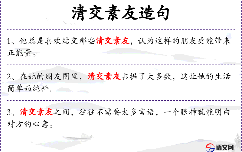 3. 【清交素友】 素友:真诚的朋友。交往纯洁,友情纯朴。