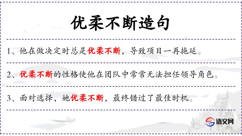 - 优柔不断:形容词短语,指一个人在决策时犹豫不决,缺乏果断。