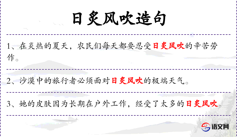 - 日炙风吹的日夜:名词短语,“日炙风吹”形容日夜的艰苦环境,“的”连接修饰语和中心词。