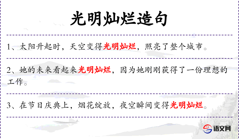 1. 【光明灿烂】 灿烂:光彩明亮的样子。形容光明耀眼,色彩艳丽。比喻事业的伟大辉煌。