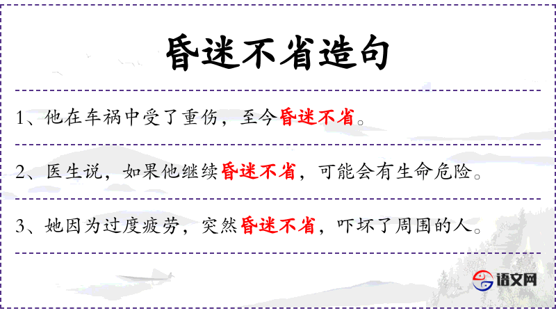 - 昏迷不省:成语,形容人失去知觉,无法自主行动。