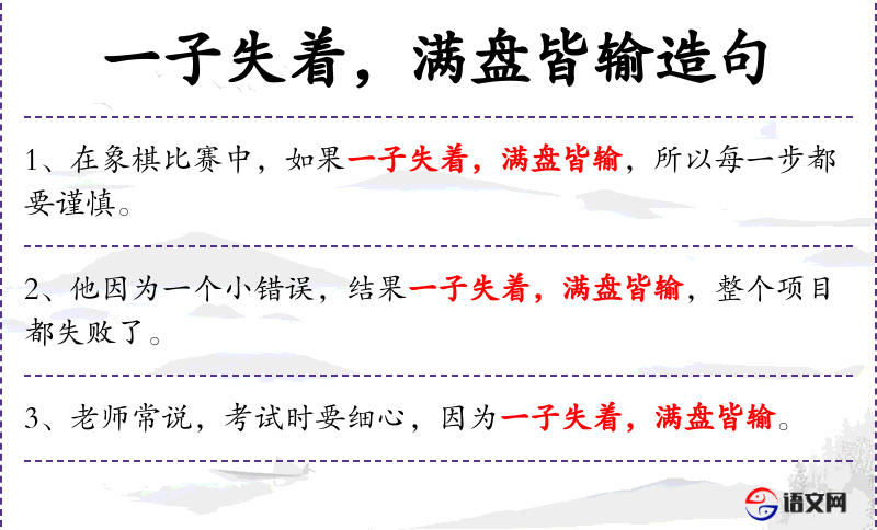 4. 【满盘皆输】 - 下棋时走错一步,整个棋就输掉。比喻因受某一局部的影响而使全局归于失败。