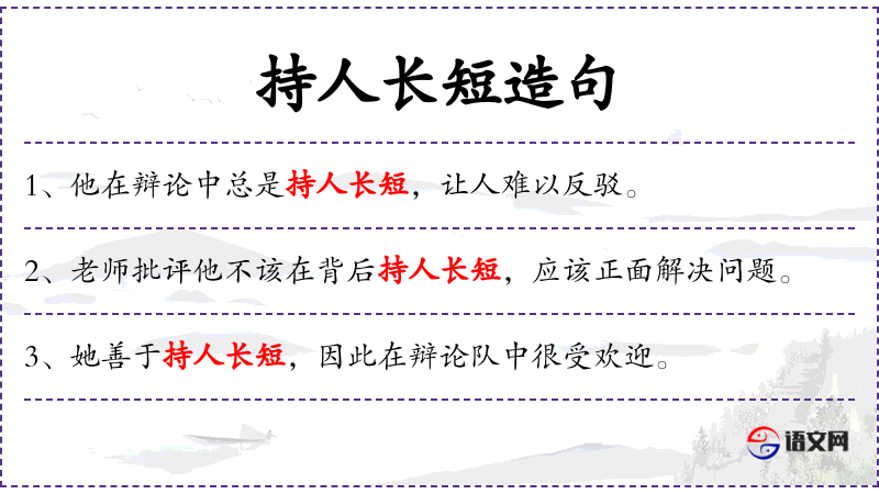 “持人长短”是一个汉语成语,源自古代的辩论文化,意为抓住对方的弱点进行攻击。这个成语反映了汉语文化中对于辩论技巧的重视。