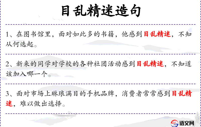 5. 【目乱精迷】 - 眼花缭乱,神情迷惑。形容所见情景复杂纷繁或怪异多变,令人惊异。