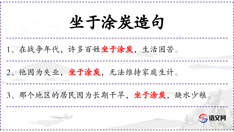- 涂炭:成语,比喻处境极其困难或悲惨。