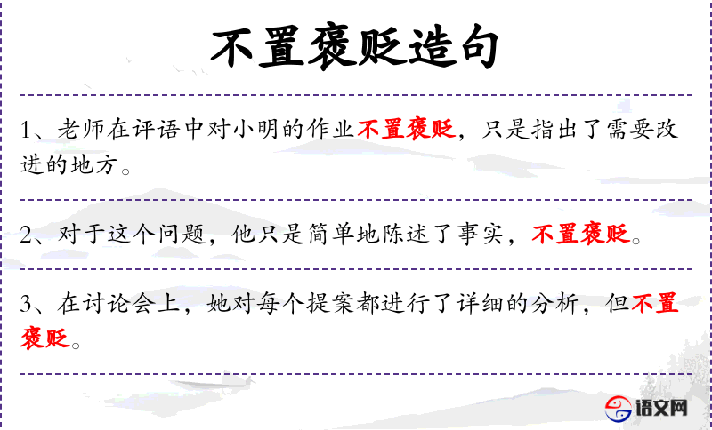 1. 【不置褒贬】 置:安放,这里有“加以”之间。褒:褒奖,夸赞,表扬。贬:贬低,指责。不加以表扬或批评。