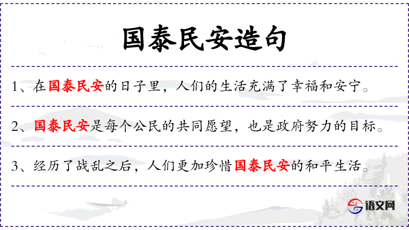 - 国泰民安:指的是国家安定,人民安居乐业的状态。