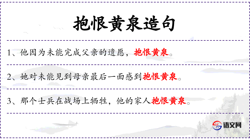 • 文化意义:“抱恨黄泉”反映了**文化中对死亡和遗憾的深刻理解。