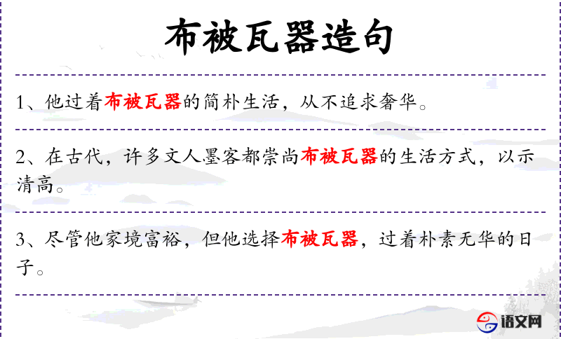 - 布被瓦器:名词短语,形容简朴的生活方式。