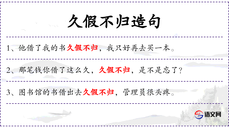 - 成语:“久假不归”源自《左传·僖公二十三年》,原意是指官员长期请假不归,后泛指借东西不还。