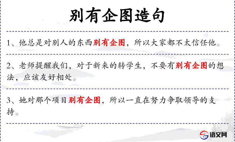 - 别有企图:固定搭配,意为有特别的意图或目的。