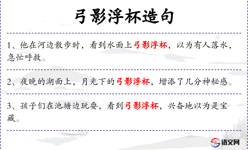 - 特定情境:一个人在河边散步时,看到了弓影和浮杯,误以为有人在游泳。