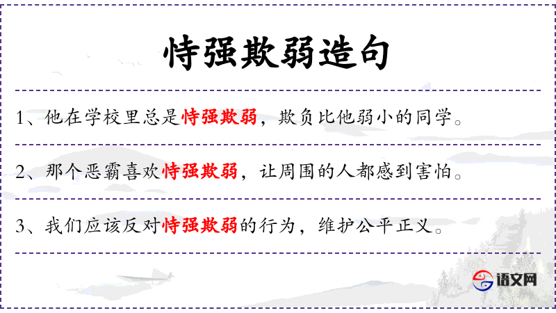 - 相关成语:“以强凌弱”是**传统文化中的一个成语,与“恃强欺弱”意思相近。