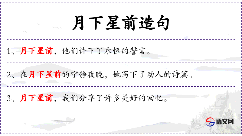 2. 【月下星前】 - 指清爽幽静的环境。借指谈情说爱的地方。