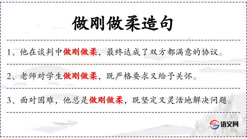 - 做刚做柔:这是一个成语,意思是既坚持原则(刚)又灵活变通(柔),在谈判中既不轻易让步,又能适时妥协。
