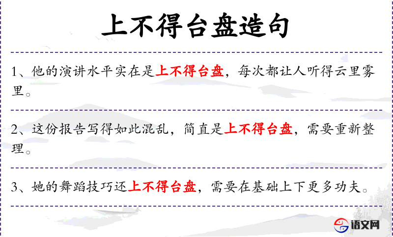 1. 【上不得台盘】 - 比喻因寒酸丑陋等见不得人。