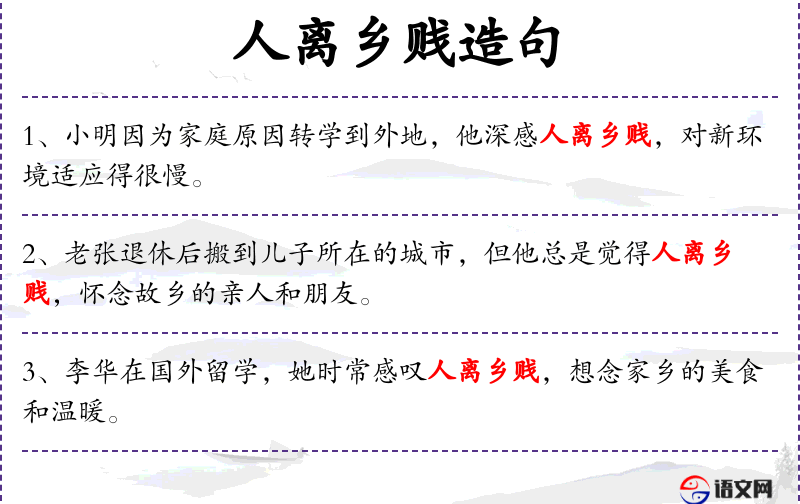 - 人离乡贱:成语,表示人离开家乡后会感到孤独和不适应。