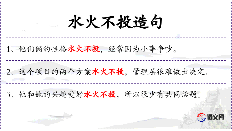 4. 【水火不投】 - 水和火是两种性质相反的东西,根本不相容。比喻二者对立,绝不相容。