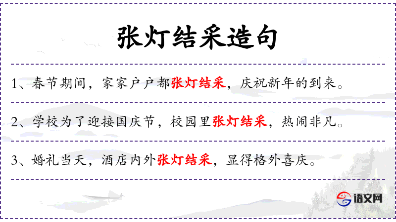 - 谓语:“张灯结采”和“欢聚一堂”。