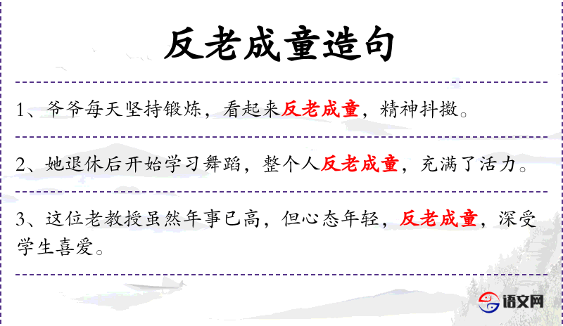- “反老成童”是一个成语,源自**传统文化,强调老年人保持年轻的心态和活力。