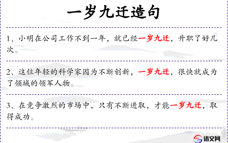 1. 【一岁九迁】 岁:年;迁:官职升迁。一年之内升迁九次。比喻官职升得极快。