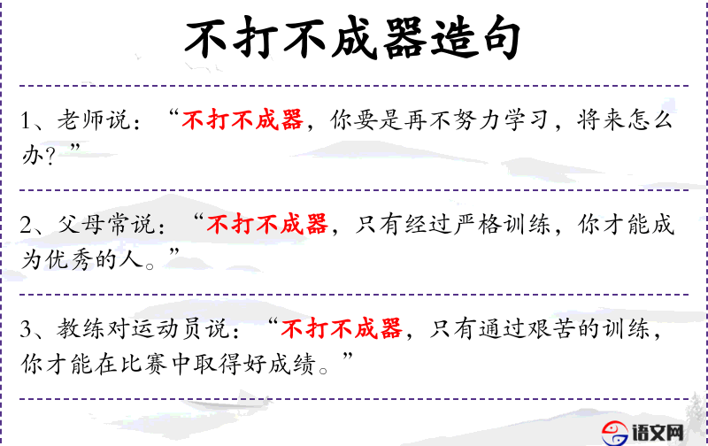 1. 【不打不成器】 - 打:打磨,打造。不打造就不能成为有用的器物。比喻不教育就不成材,没出息。
